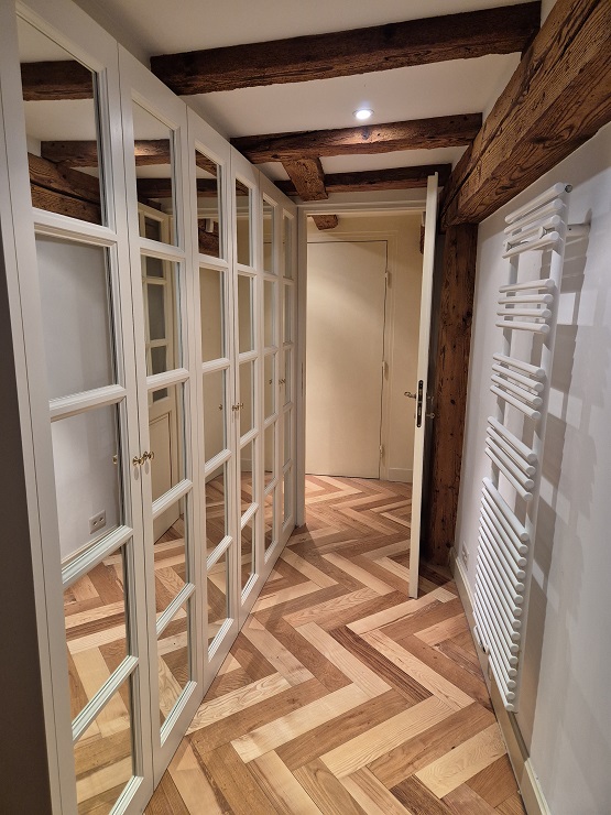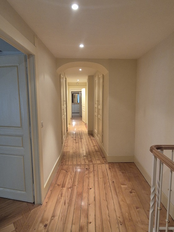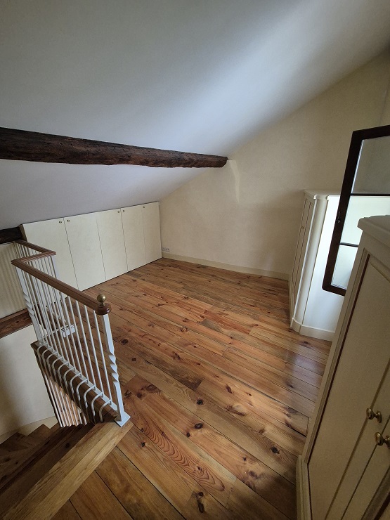 Un hall d'entrée avec WC visiteurs distribue les différentes pièces du logement, une belle chambre à coucher avec une salle de bain attenante et un espace dressing, ainsi qu'une deuxième chambre avec accès à une mezzanine, pouvant servir de bureau, de dressing ou de salon TV. Une salle de douche complète ce niveau.